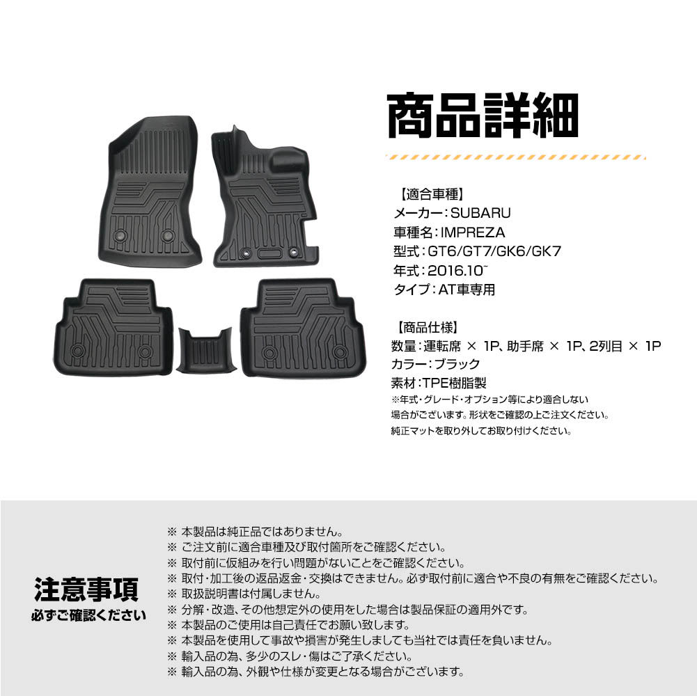 インプレッサ G4 GT6/GT7/GK6/GK7 AT車専用 3D立体設計 3Dマット 3D立体マット 3D フロアマット 防水マット ラバーマット 防水 ラバー フロア 1台分 立体カーマット 滑り防止 汚れ防止