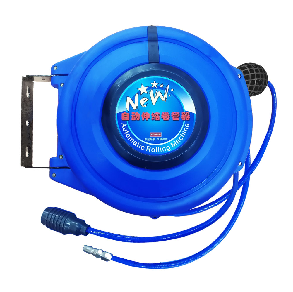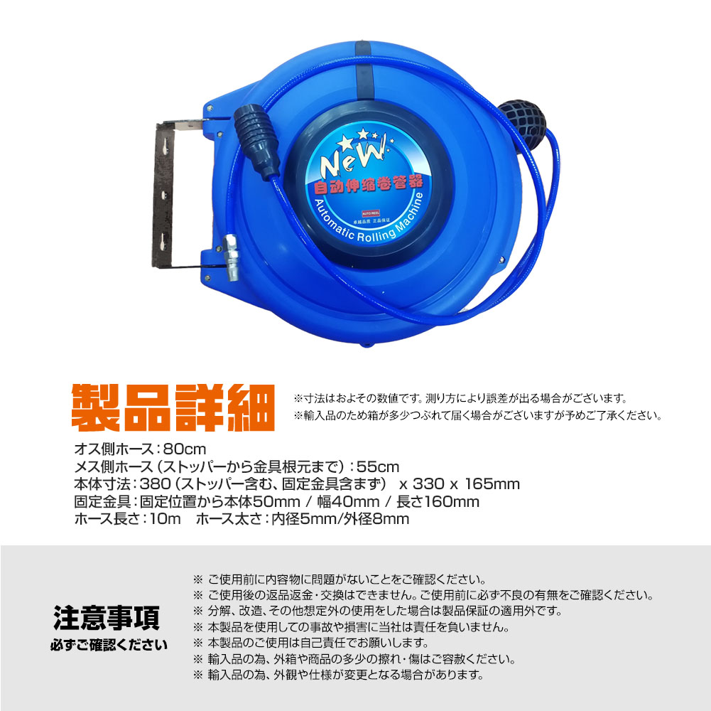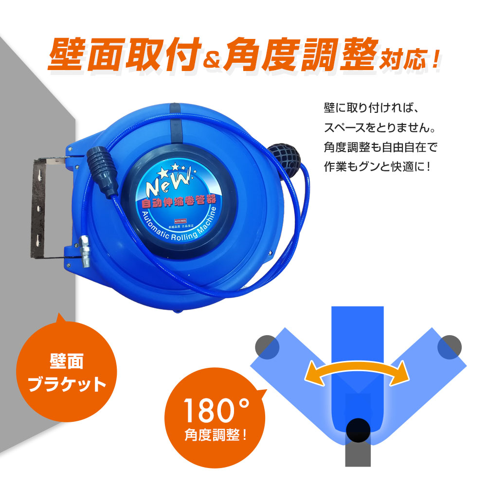 最大10mのエアーホースを自由に引き出し、使わないときは少し引っ張ると自動で巻き上げ!