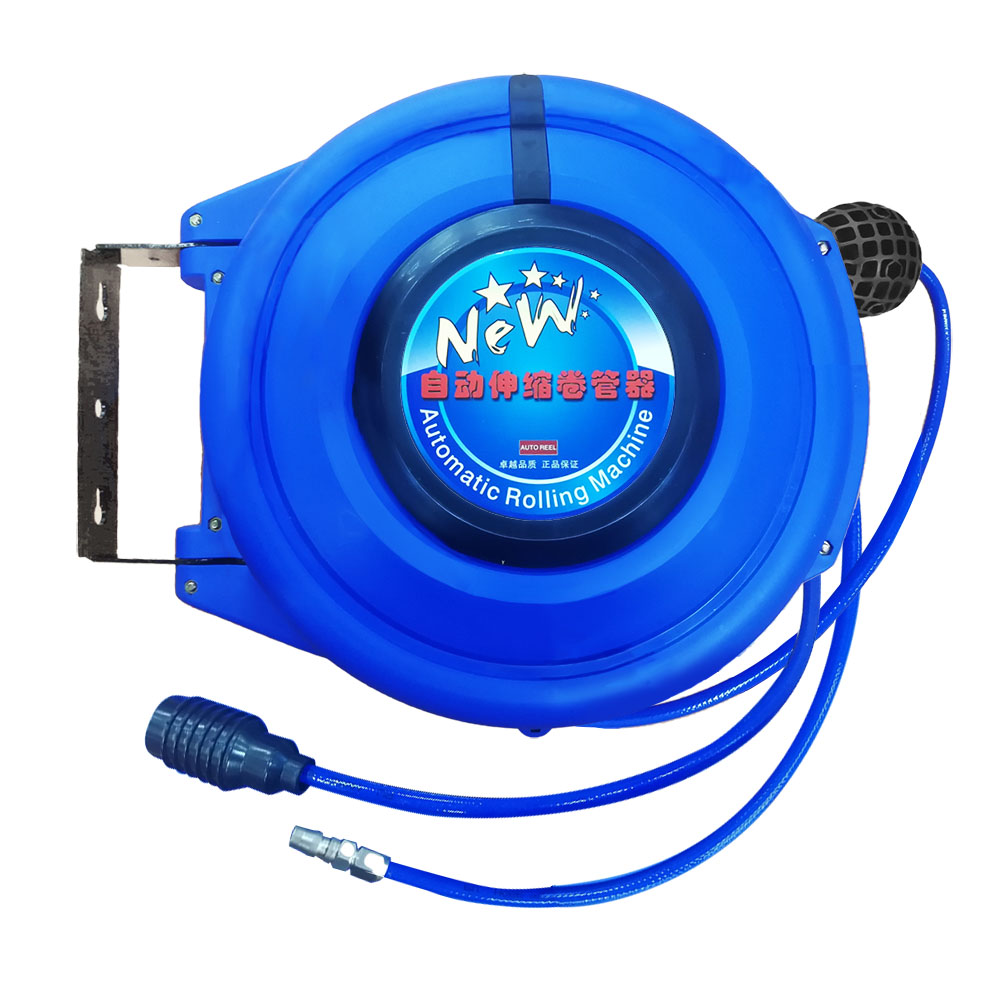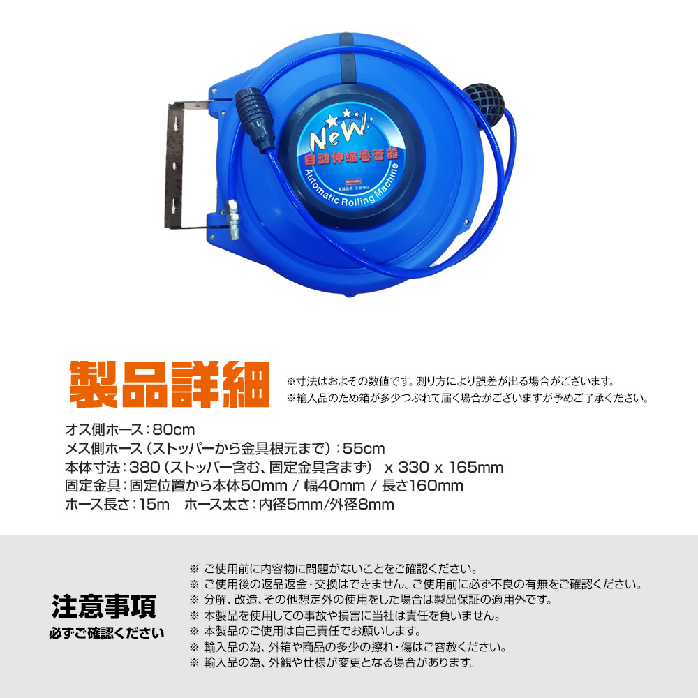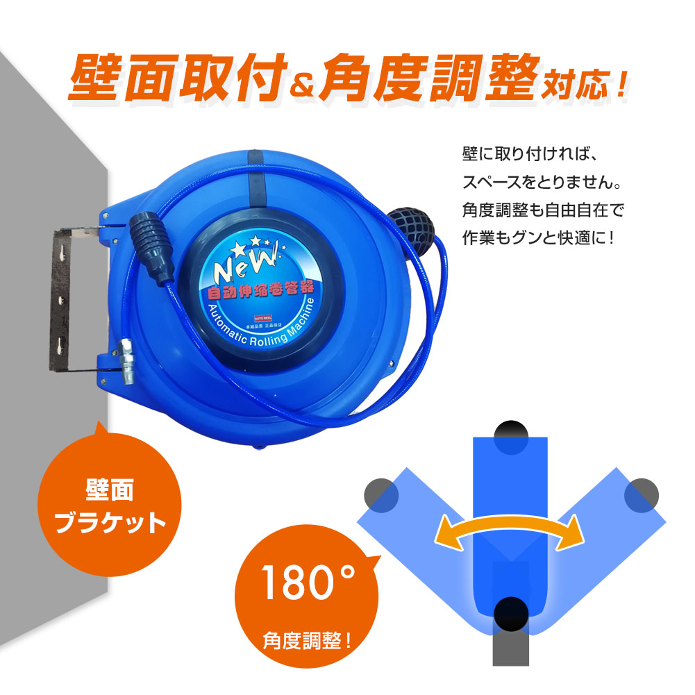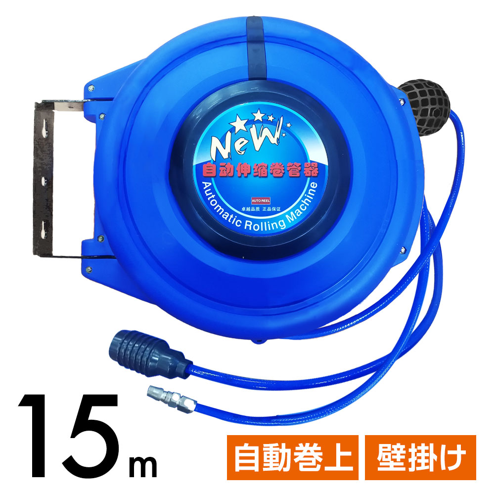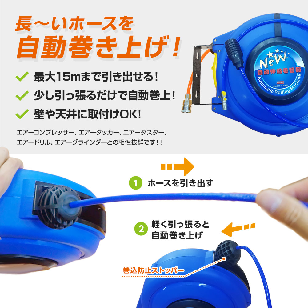 最大15mのエアーホースを自由に引き出し、使わないときは少し引っ張ると自動で巻き上げ!