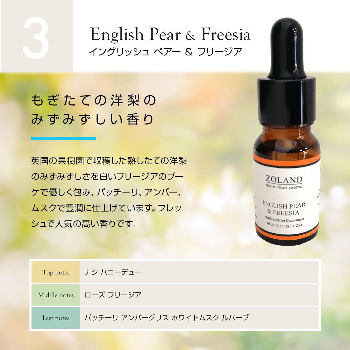 英国の果樹園で収穫した熟したての洋梨のみずみずしさを白いフリージアのブーケで優しく包み、パッチーリ、アンバー、ムスクで豊潤に仕上げています。フレッシュで人気の高い香りです。