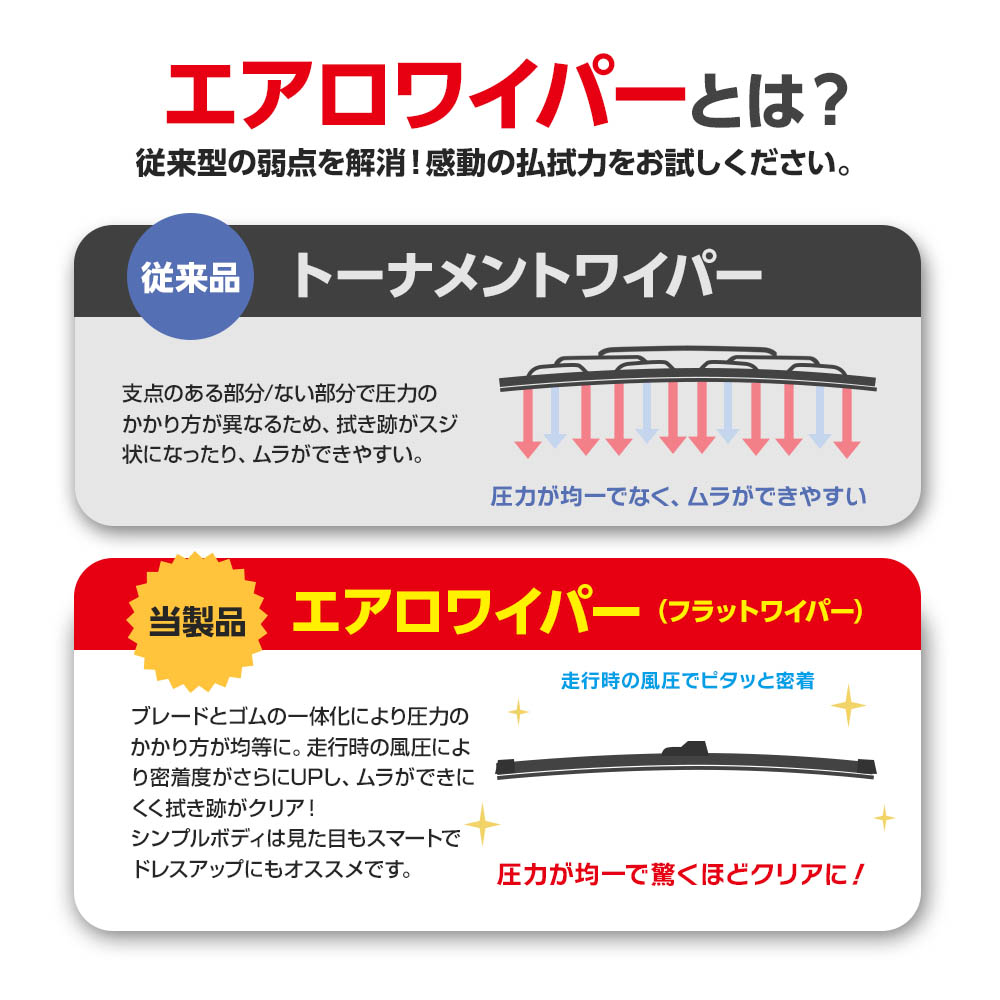 ・エアロ構造ならではの空気抵抗を利用した確かな水切り性能、抜群の払拭性