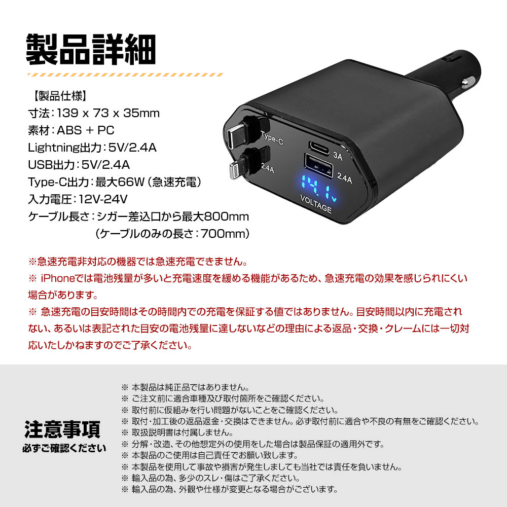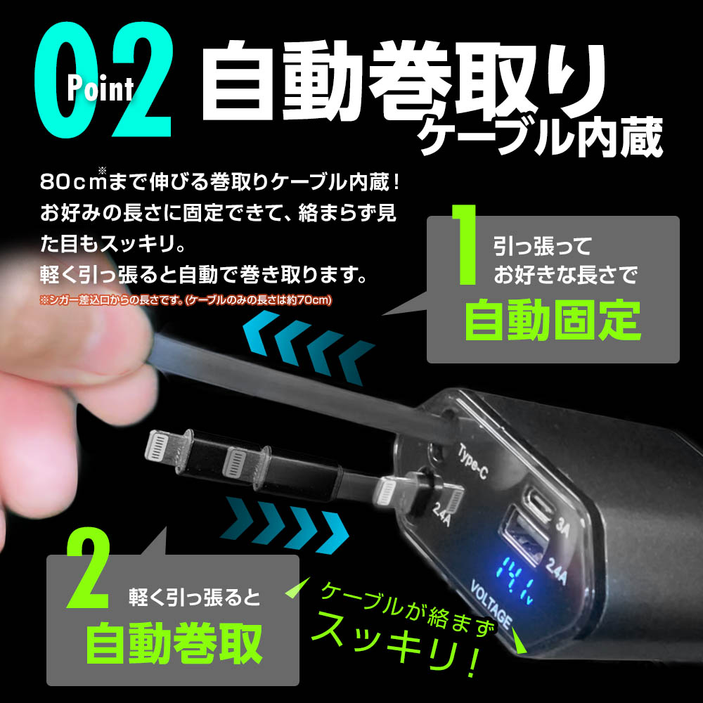 巻き取り式のケーブルを採用し、車内をすっきりと保ちながら、あらゆるシーンで便利に使えます。