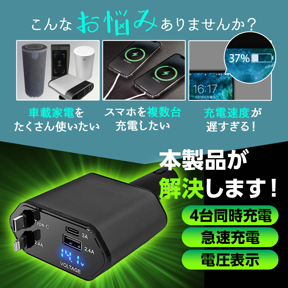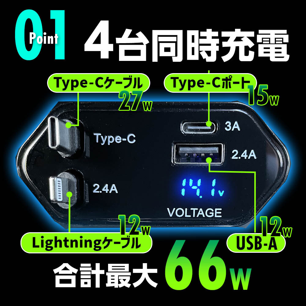 合計4台のデバイスを同時に充電できるので、家族やグループでのドライブ、旅行に最適。