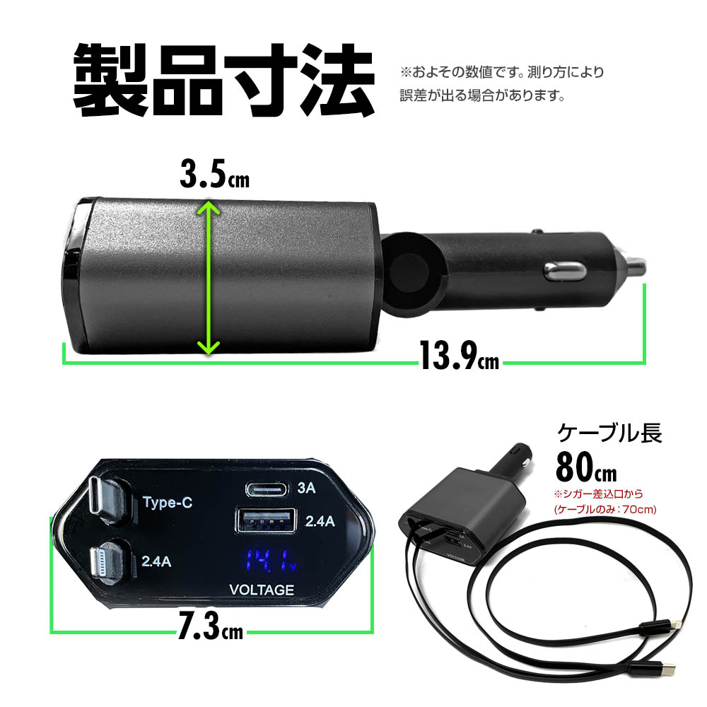 ケーブル長は最大80cmまで伸縮可能。前席・後席両方で快適に充電でき、長時間の使用でも便利に使えます。