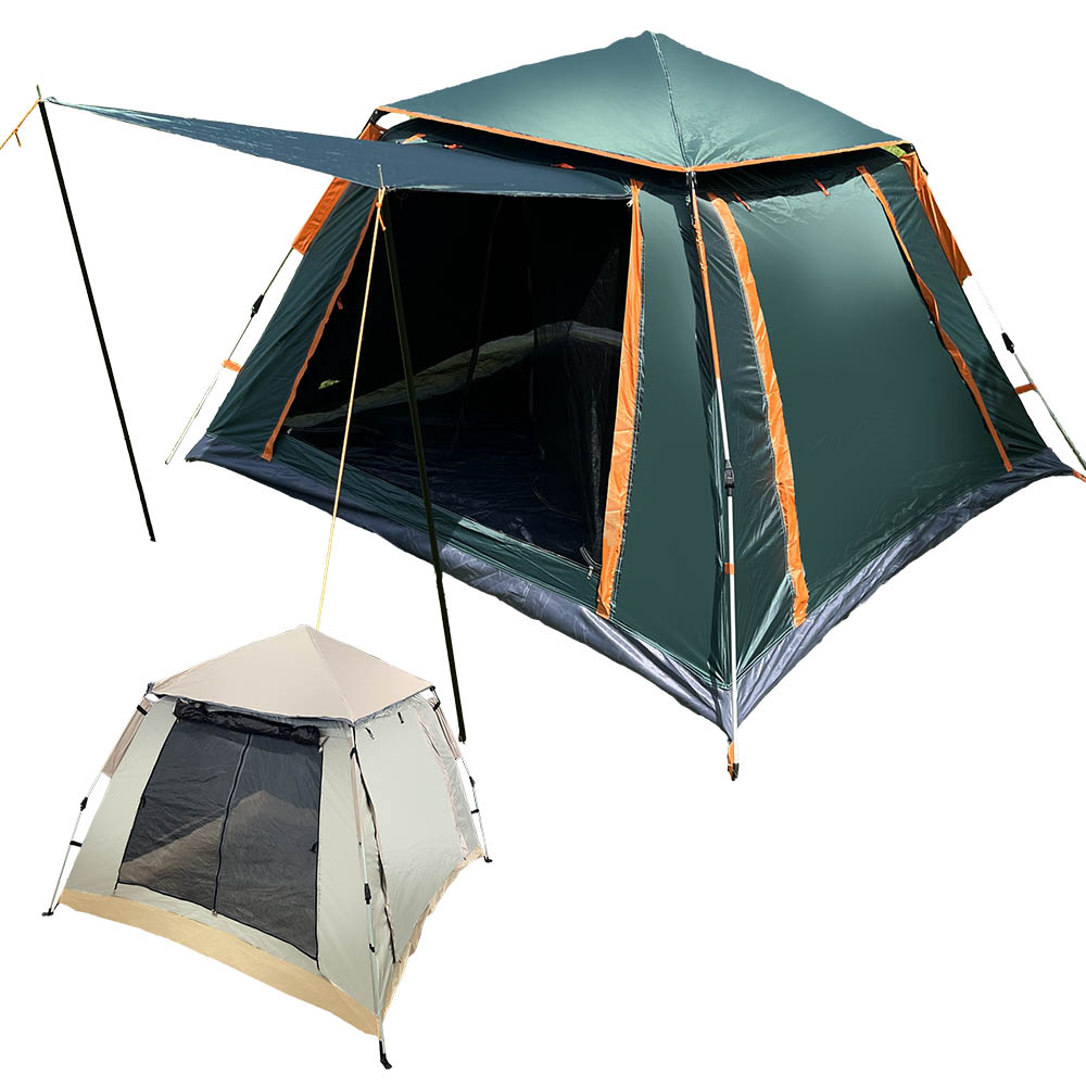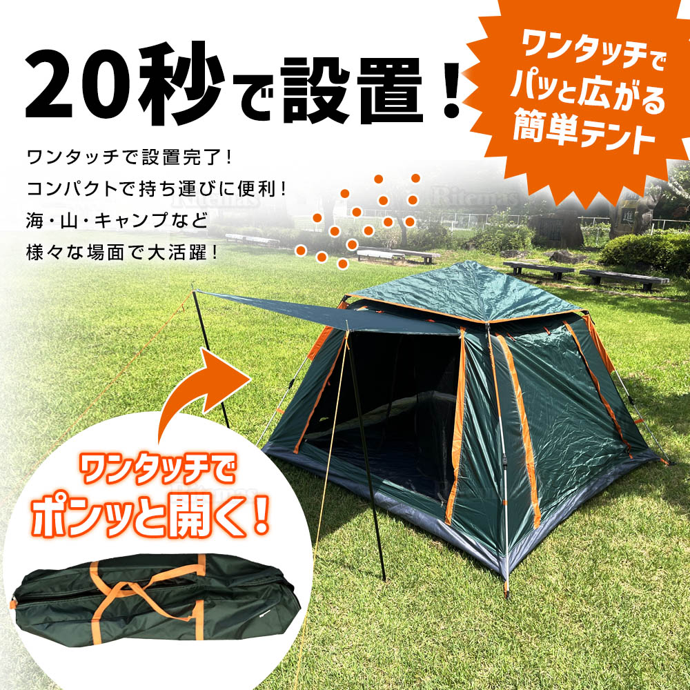 ワンタッチで簡単に設置可能な2窓2ドアのドーム型テント(3〜4人用)
