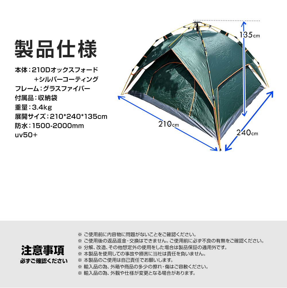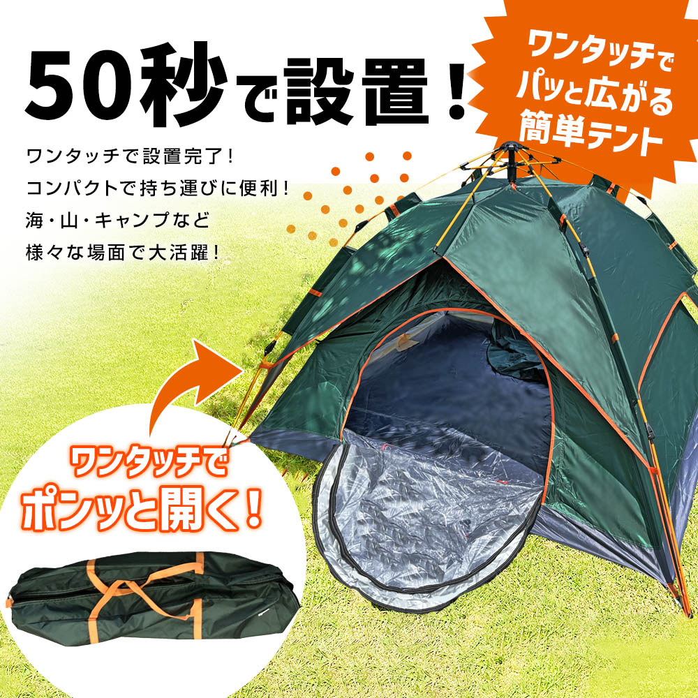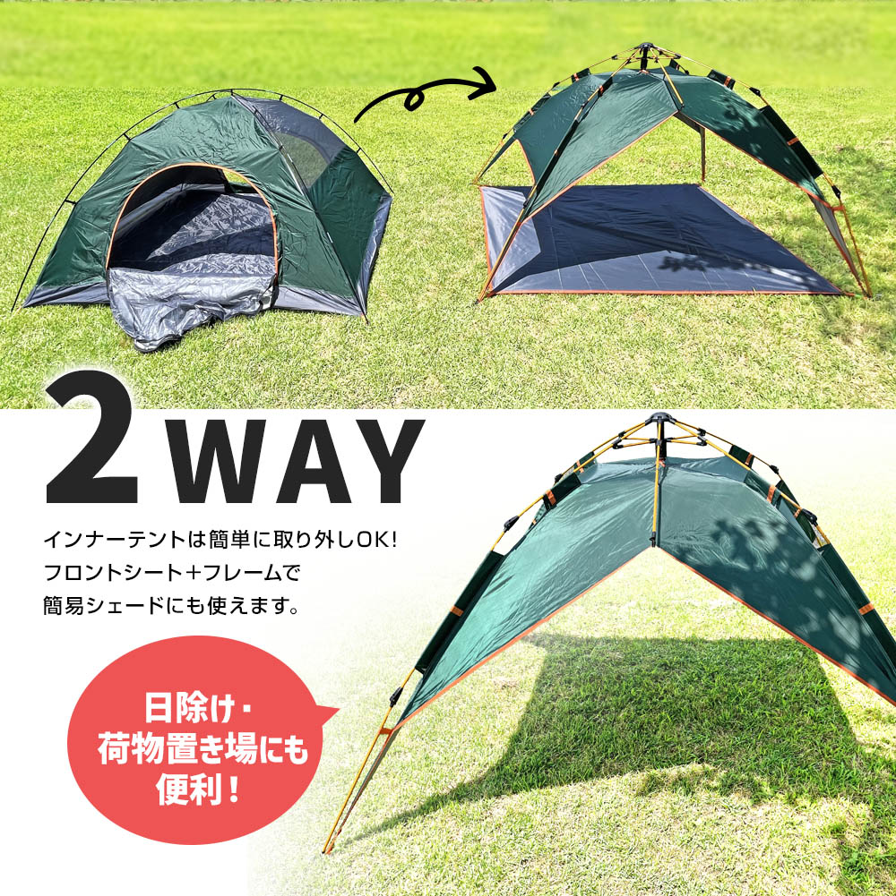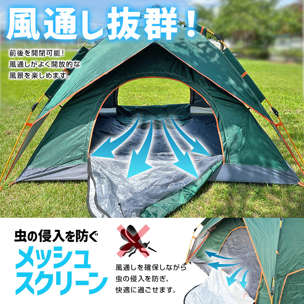 ワンタッチで簡単に設置可能な2ドア2WAYのドーム型テント(3〜4人用)