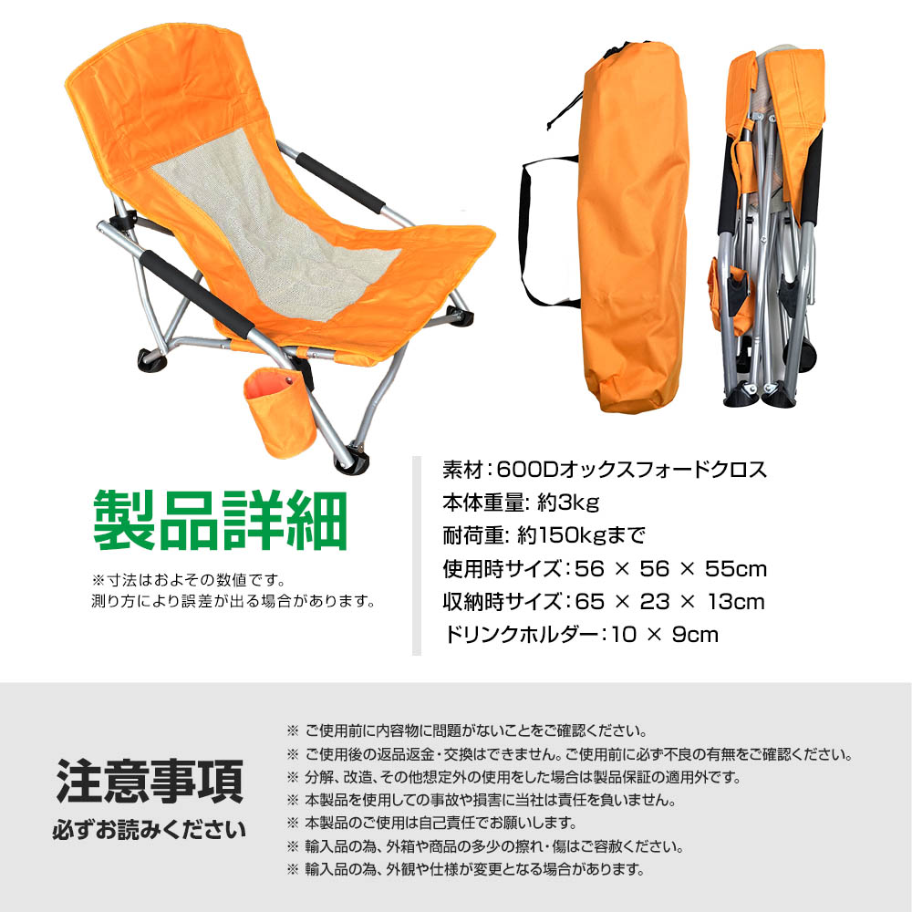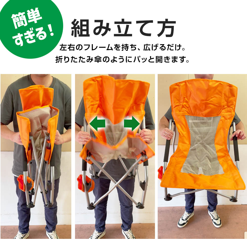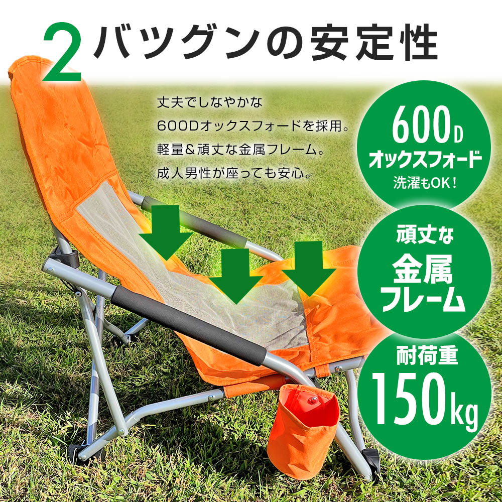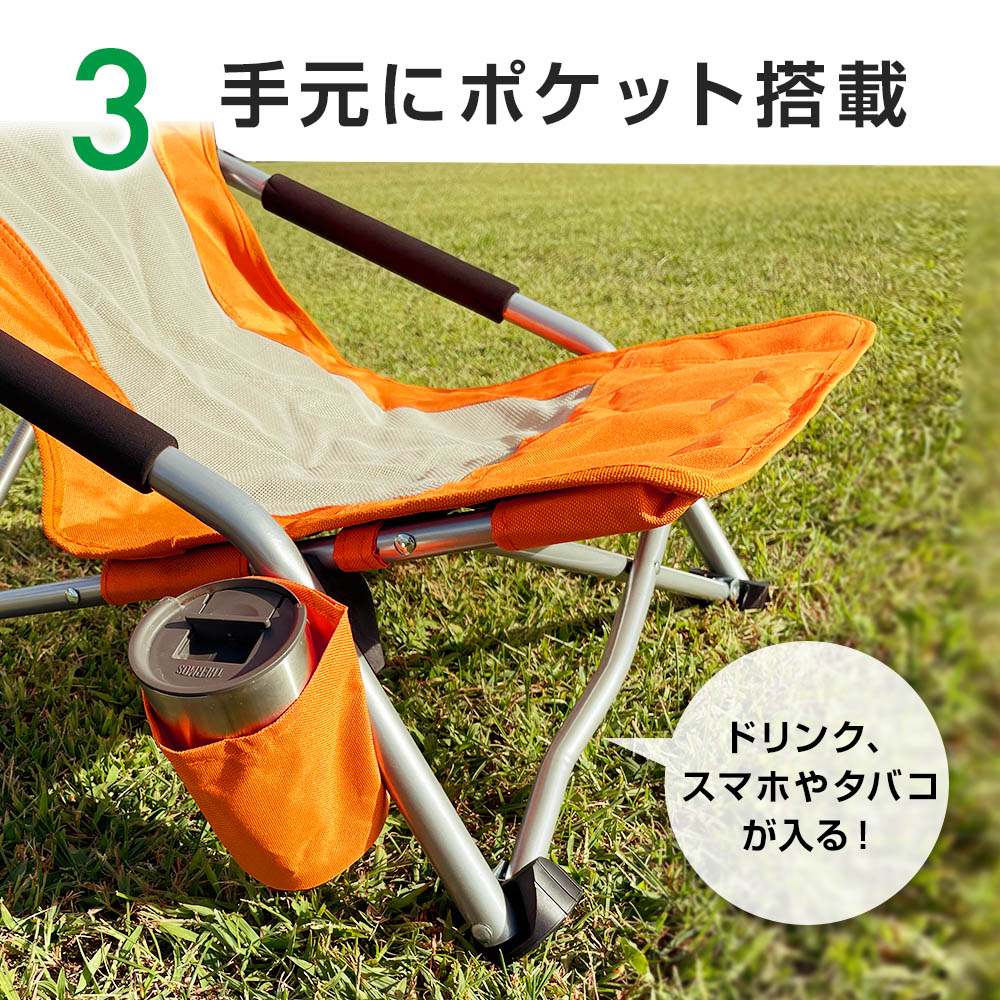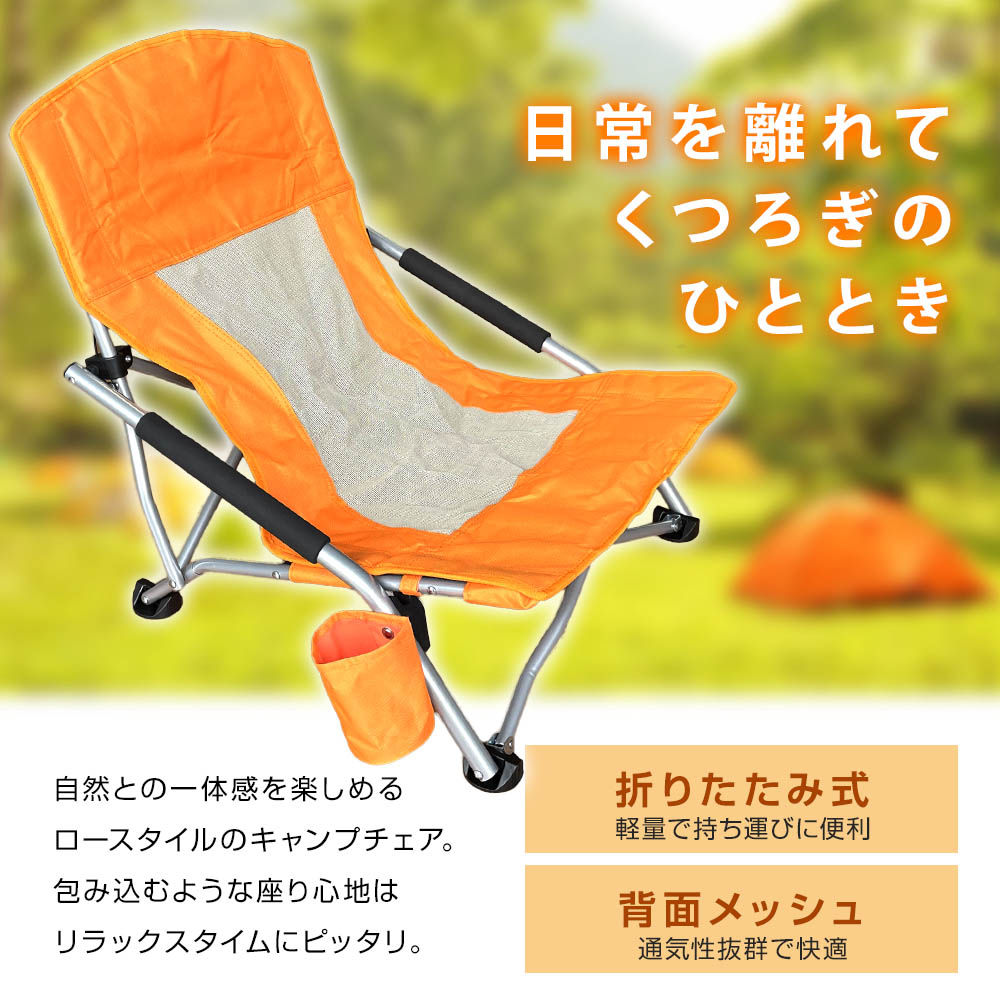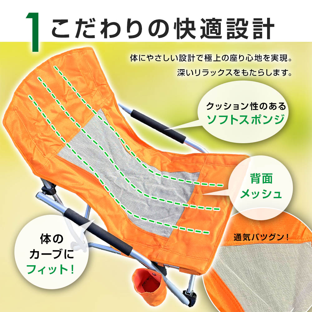 このキャンプチェアは、座り心地を最優先に考えたロースタイル。