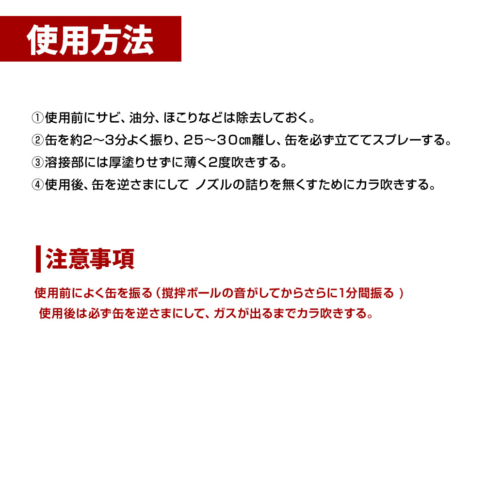 ・車体修理で溶接部分の亜鉛メッキや、もともと亜鉛メッキされた部品、特に塗装が出来ない物との組み合わせに使用。