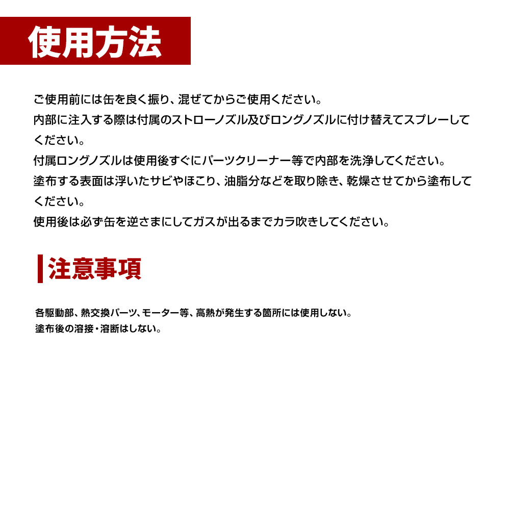 ※自動車の駆動部、熱交換パーツ、モーター、エンジン、マフラーなどには塗布しないでください。