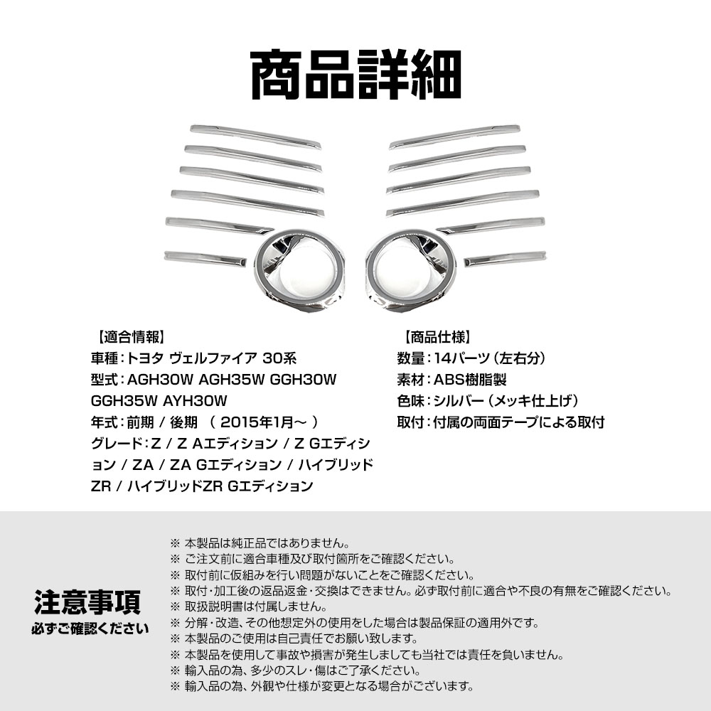 TOYOTA ヴェルファイア 30系 前期 フォグランプ フォグライト フォグ ガーニッシュ シルバー メッキ仕上げ ABS仕様 18パーツ入り AYH / GGH / AGH3# 2015年1月~2017年12月 VELLFIRE ベルファイア アルヴェル ヴェルファイヤ ベルファイヤ
