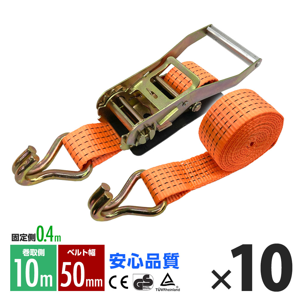 ラッシングベルト フック トラック 幅 50mm ラチェットベルト ラチェット式 固定側0.4m 巻側10m 荷重4000kg タイダウンベルト 10本 1年保証