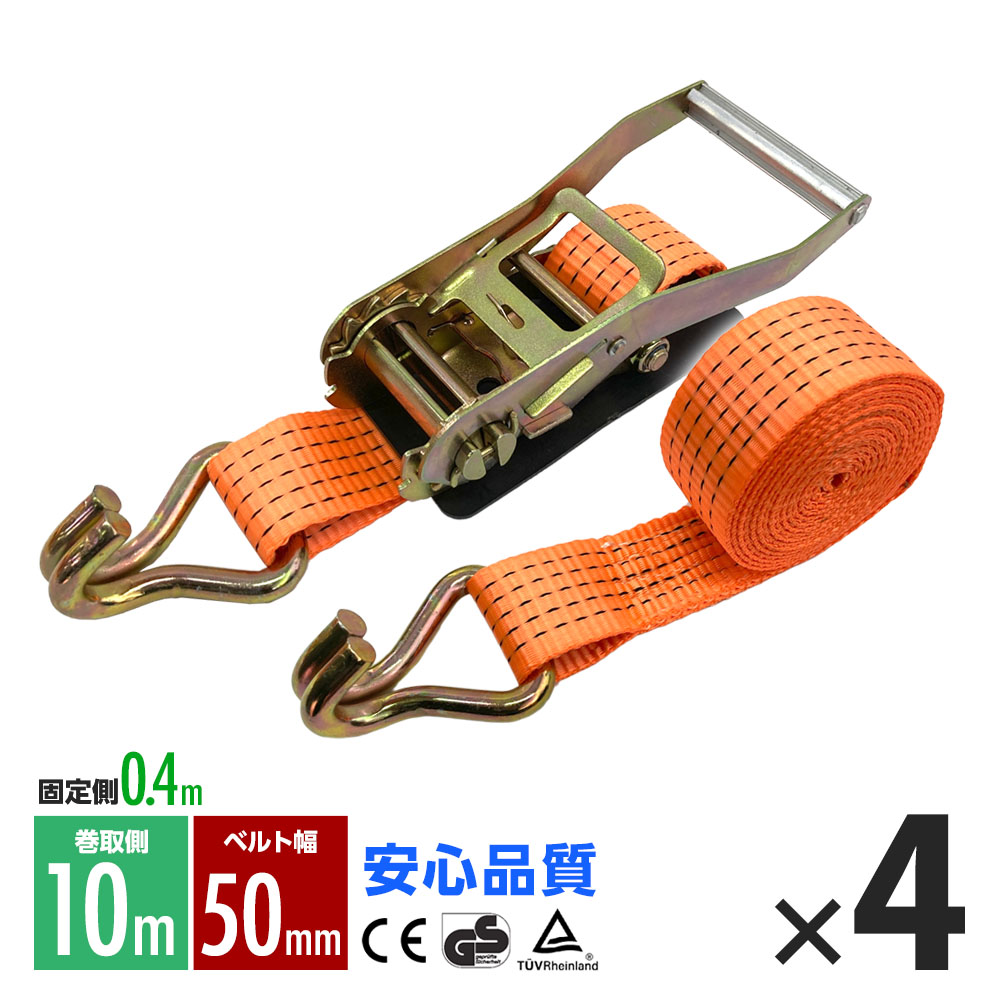 ラッシングベルト フック トラック 幅 50mm ラチェットベルト ラチェット式 固定側0.4m 巻側10m 荷重4000kg タイダウンベルト 4本 1年保証
