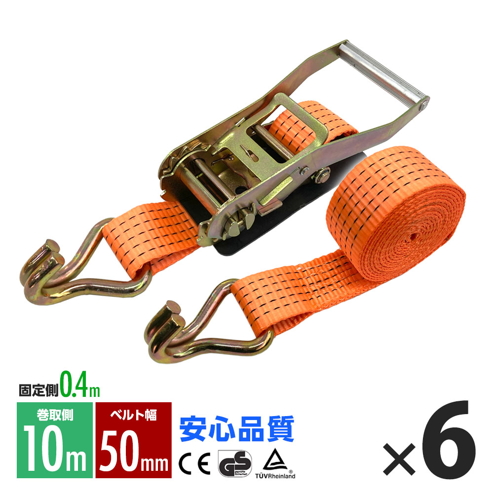 ラッシングベルト フック トラック 幅 50mm ラチェットベルト ラチェット式 固定側0.4m 巻側10m 荷重4000kg タイダウンベルト 6本 1年保証