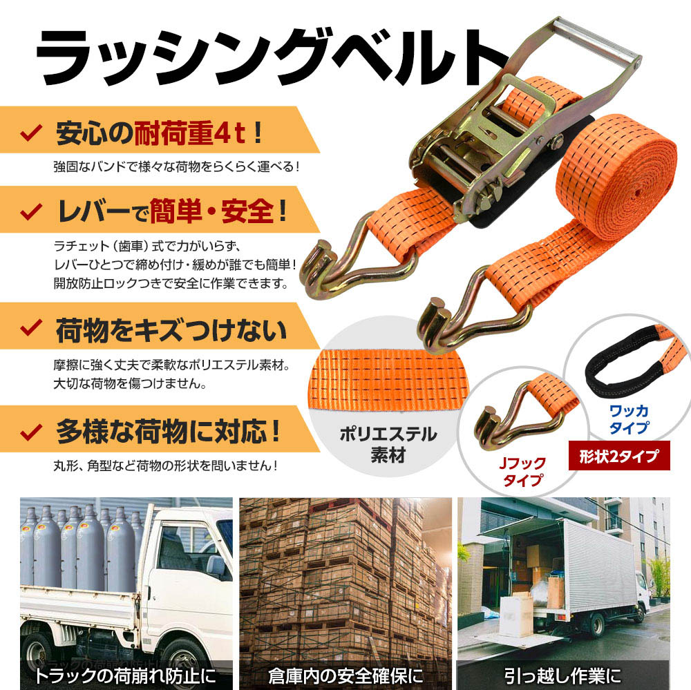 ラッシングベルト ワッカ トラック用 幅 50mm ラチェットベルト ラチェット式 固定側0.4m 巻側8m 荷重2000kg タイダウンベルト 4本 1年保証