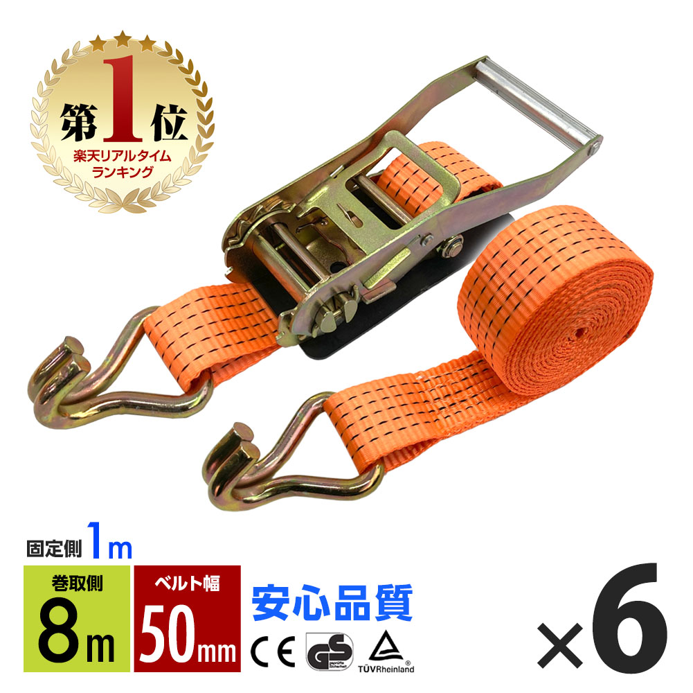 ラッシングベルト フック トラック 幅 50mm ラチェットベルト ラチェット式 固定側1m 巻側8m 荷重4000kg タイダウンベルト 6本set 1年保証