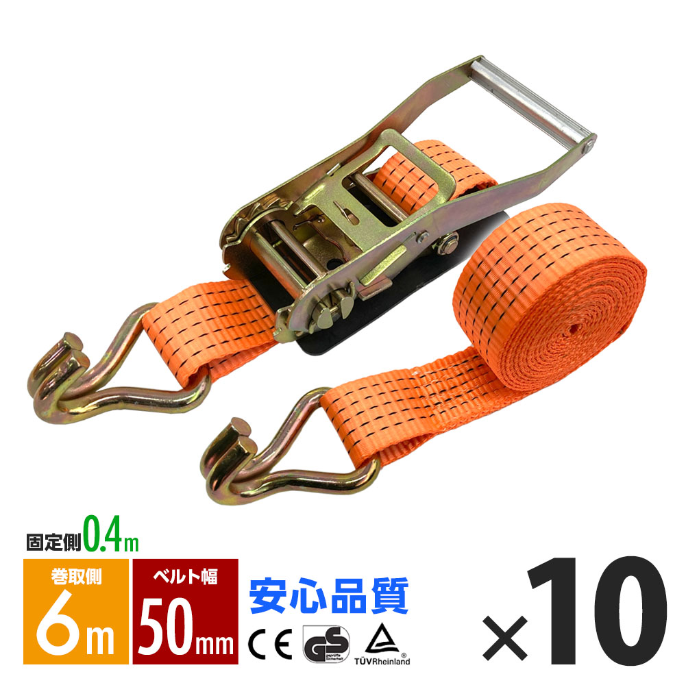 ラッシングベルト フック トラック 幅 50mm ラチェットベルト ラチェット式 固定側0.4m 巻側6m 荷重4000kg タイダウンベルト 10本 1年保証