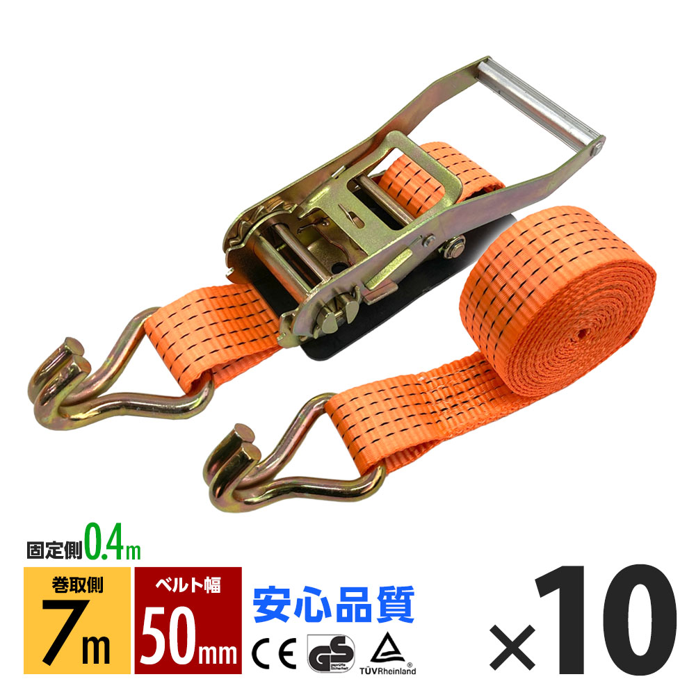 ラッシングベルト フック トラック 幅 50mm ラチェットベルト ラチェット式 固定側0.4m 巻側7m 荷重4000kg タイダウンベルト 10本 1年保証