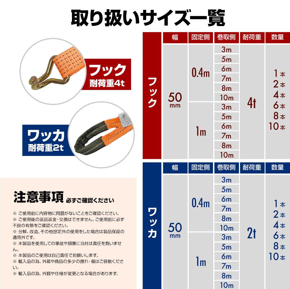 ラッシングベルト ワッカ トラック 幅 50mm ラチェットベルト ラチェット式 固定側0.4m 巻側6m 荷重2000kg タイダウンベルト 10本 1年保証