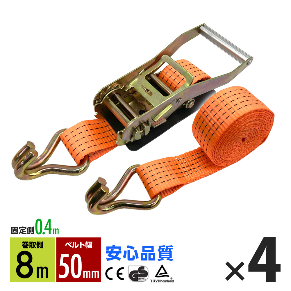 ラッシングベルト フック トラック 幅 50mm ラチェットベルト ラチェット式 固定側0.4m 巻側8m 荷重4000kg タイダウンベルト 4本 1年保証