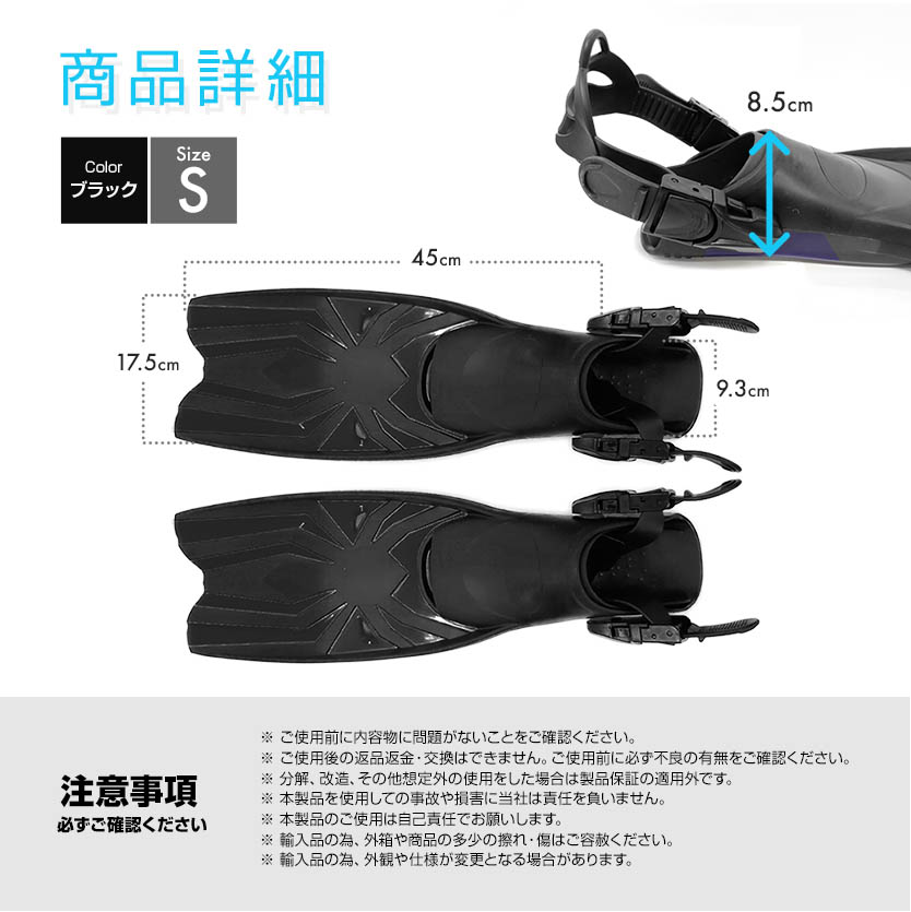 フィン シュノーケル 足ひれ スノーケリング シュノーケリング スキューバーダイビング マリンスポーツ 素潜り 黒 ブラック Sサイズ
