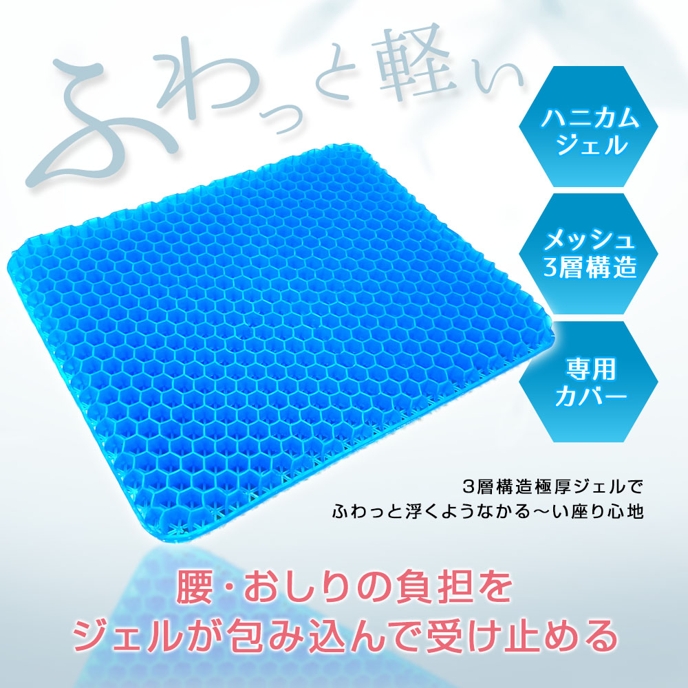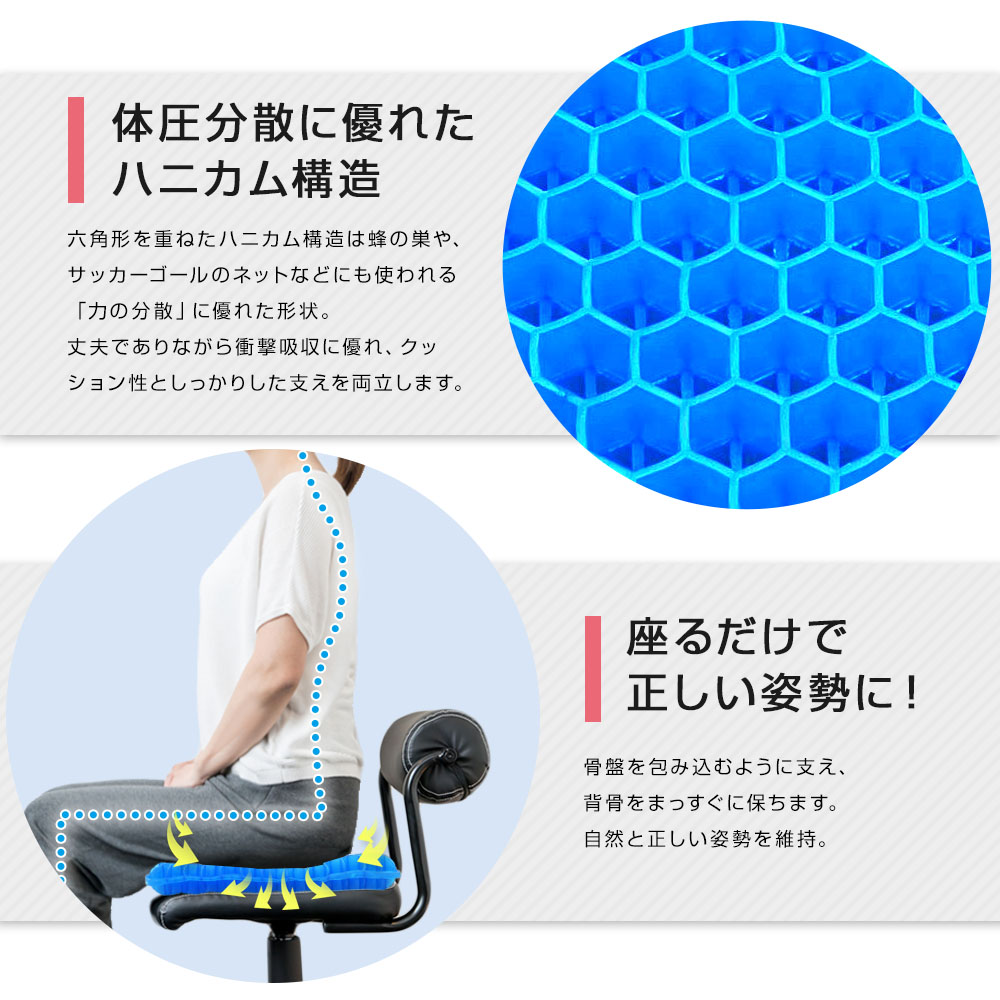 弾力性のあるハニカム構造ジェルが体圧を吸収・分散し、腰への負担を軽減。