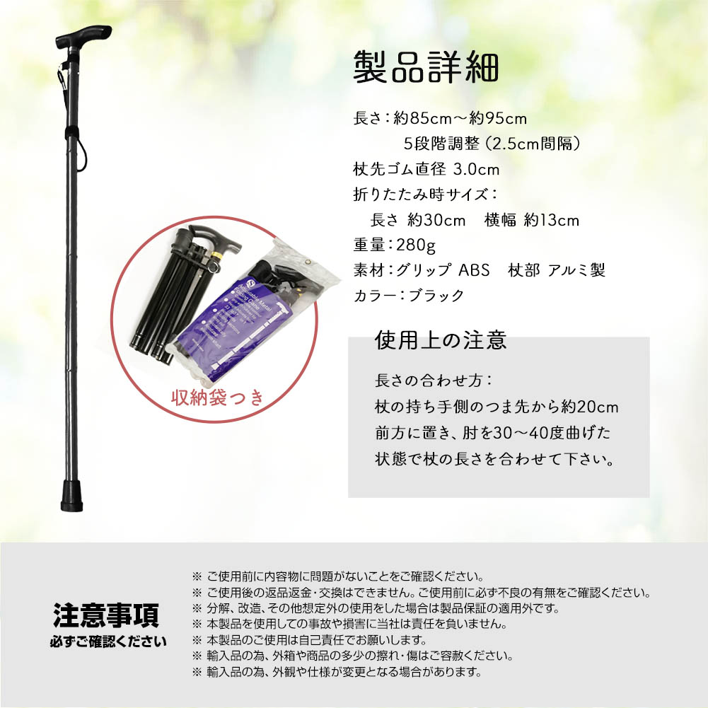 本体サイズ:長さ 約85cm~約95cm 5段階調整(2.5cm間隔) 杖先ゴム直径 3.0cm