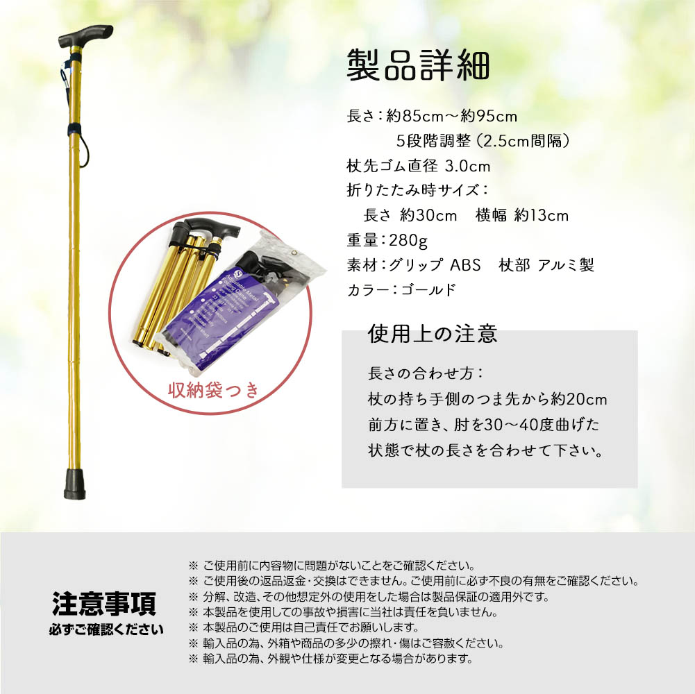 • 軽量 アルミ 折りたたみ杖 アルミステッキ 杖 折り畳み杖 ステッキ 介護 折り畳み 伸縮85cm 95cm 5段階調整 登山 つえ 老人 敬老の日 金色