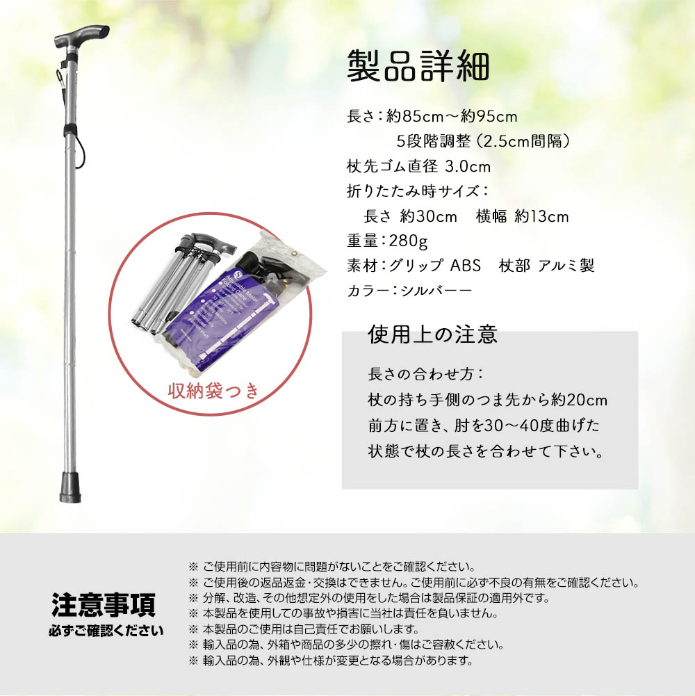 • 軽量 アルミ 折りたたみ杖 アルミステッキ 杖 折り畳み杖 ステッキ 介護 折り畳み 伸縮85cm 95cm 5段階調整 登山 つえ 老人 敬老の日 銀色