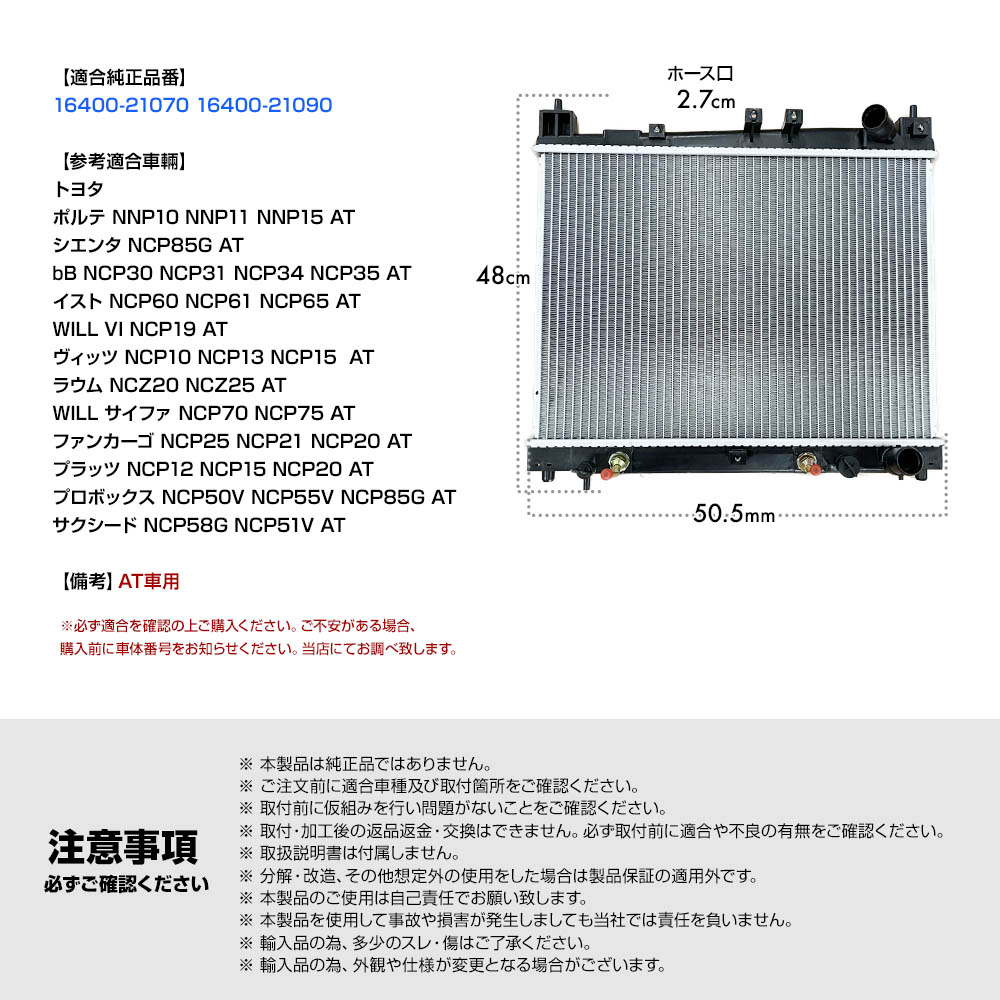 新品 ラジエーター トヨタ ヴィッツ NCP10 NCP13 NCP15 AT 社外 ラジエター 16400-21070 16400-21090