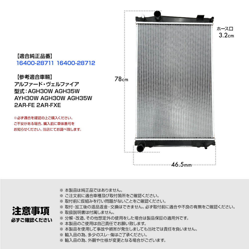 新品 ラジエーター トヨタ ヴェルファイア AGH30W AGH35W AYH30W AGH30W AGH35W 2AR-FE 2AR-FXE 社外 ラジエター 16400-28711 16400-28712