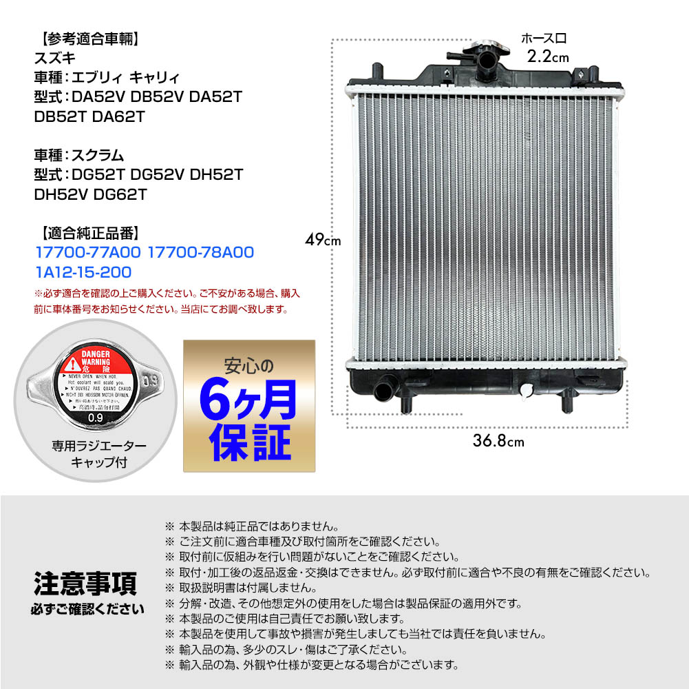 6ヵ月保証 ラジエーター スズキ エブリィ キャリィ DA52V DB52V DA52T DB52T DA62T 社外 ラジエター 17700-77A00 17700-78A00 1A12-15-200