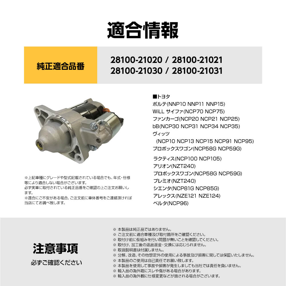 スターターモーター セルモーター トヨタ bB(NCP30 NCP31 NCP34 NCP35) ヴィッツ(NCP10 NCP13 NCP15 NCP91 NCP95) 28100-21020