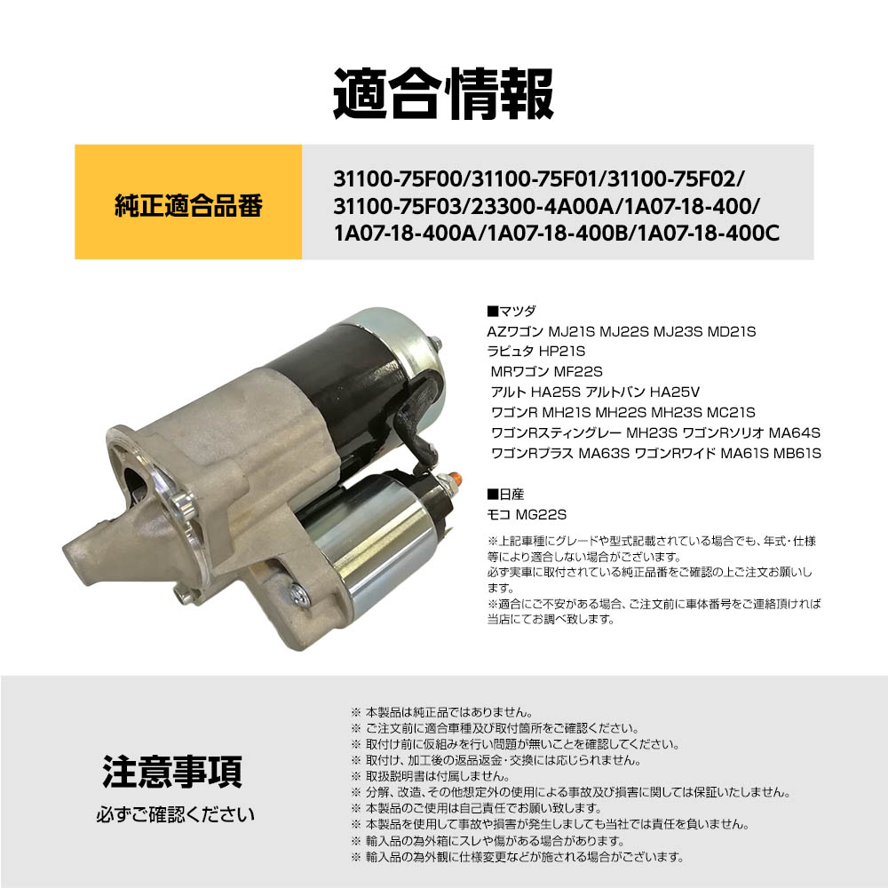 スターターモーター セルモーター マツダ AZワゴン MJ21S MJ22S MJ23S MD21S 1A07-18-400 1A07-18-400A 1A07-18-400B 31100-75F02