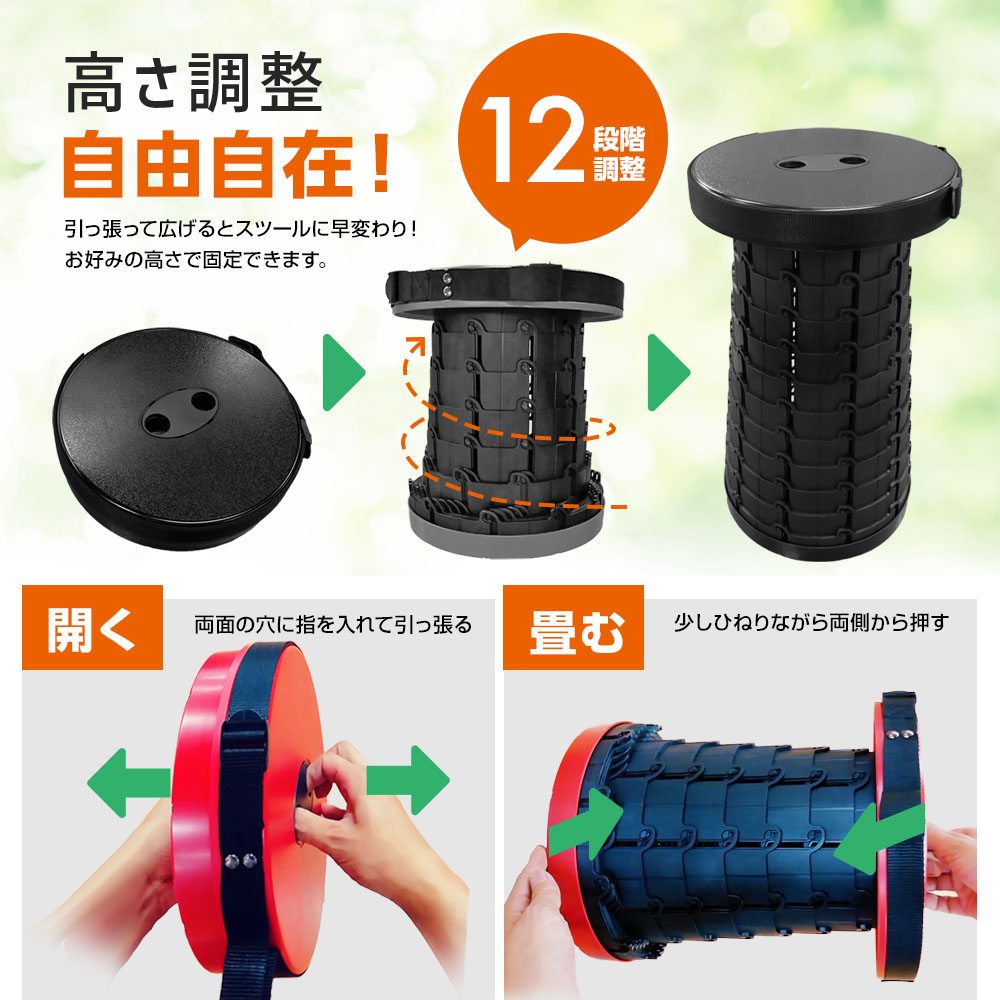 簡単で素早く開閉でき、高度自由調節アウトドアチェアです。展開する前にはまるいバックの形で、全然チェアの様子に見えないです。展開する後は高度46cmの椅子になり、更に好きな高度を選択して回転して調節できます。面白くて、携帯も収納も便利です!
