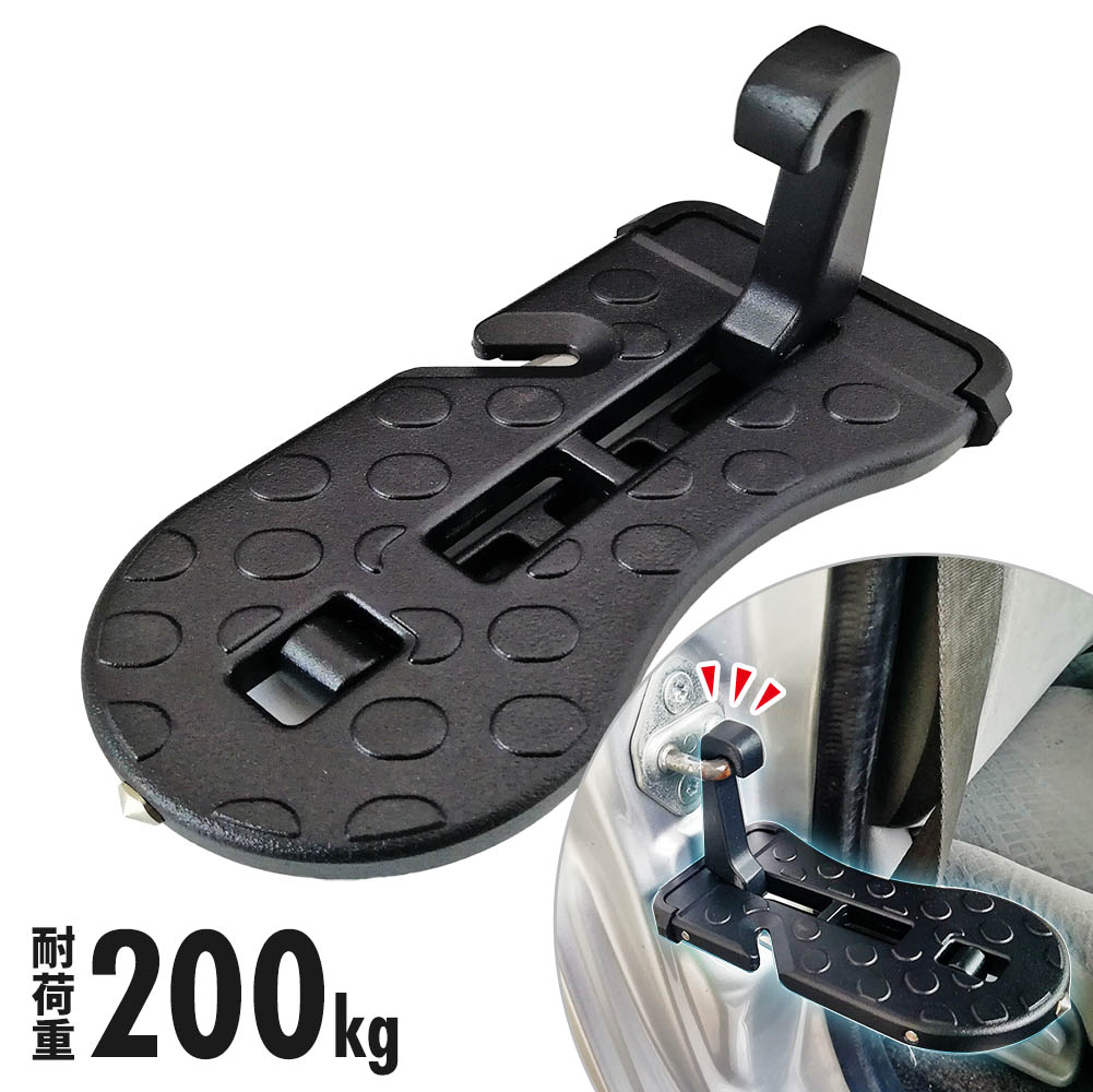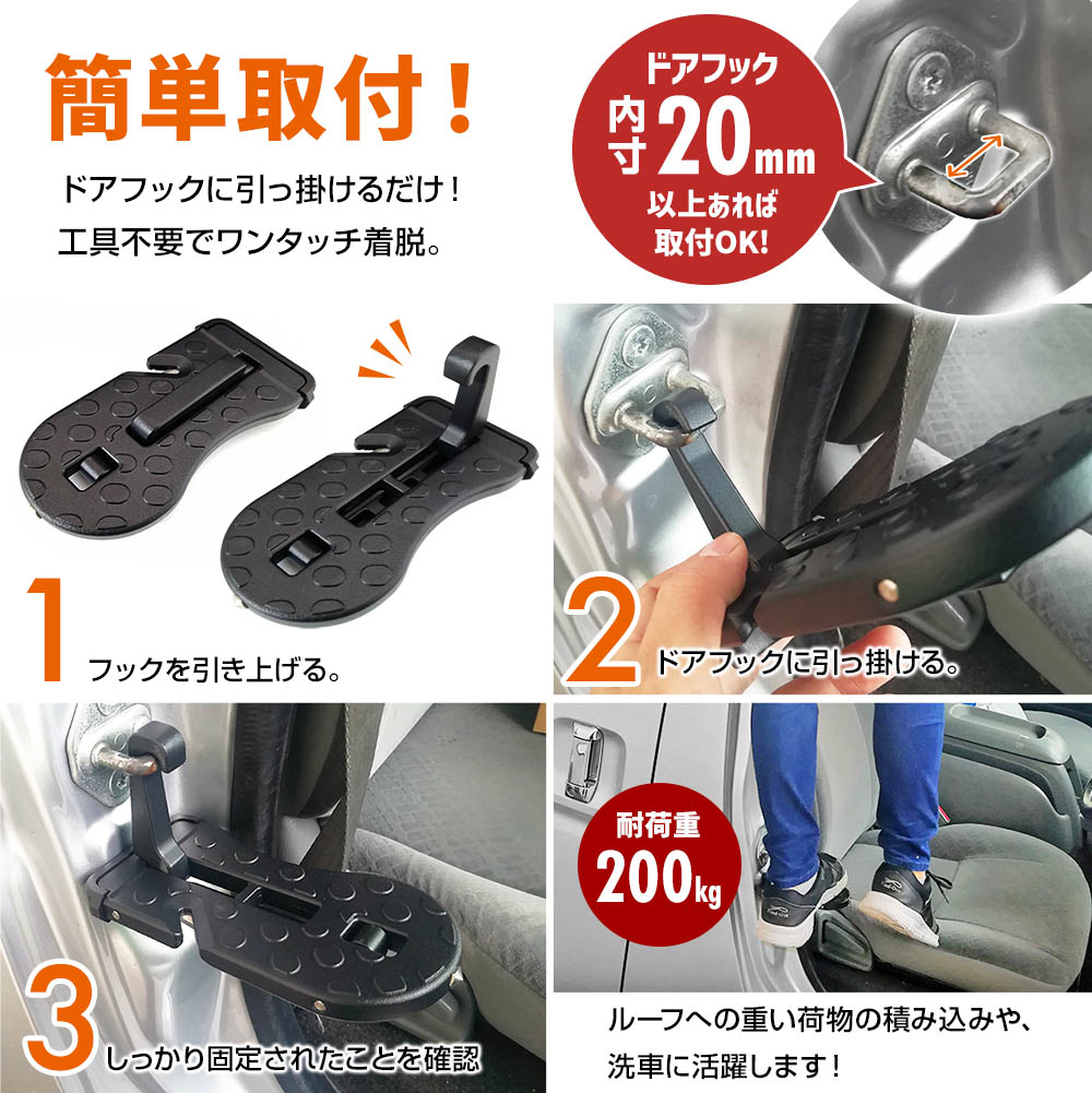 Step2 フックを利用して車側面のリングに取り付けて、ステップをドア側面に固定する。