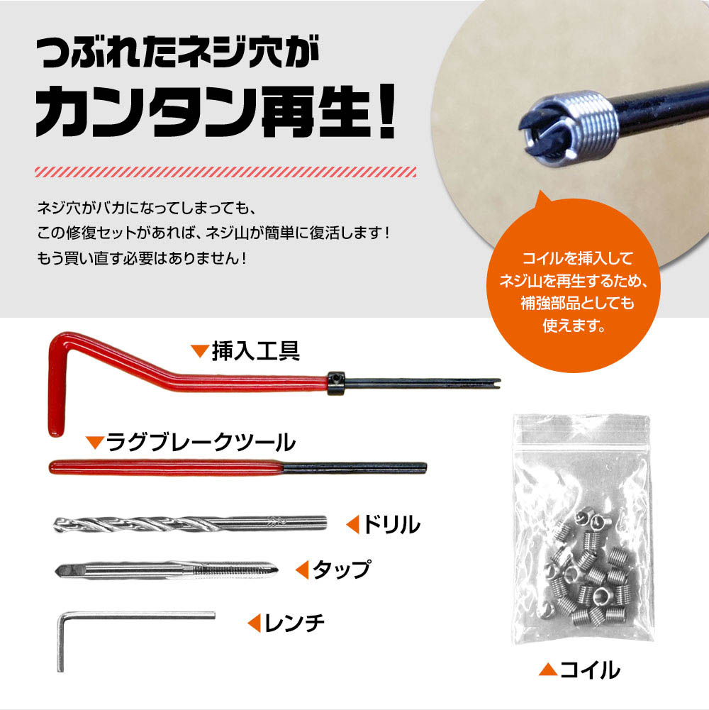 構成内容:ドリル、タップ、コイル、挿入工具、ラグブレークツール