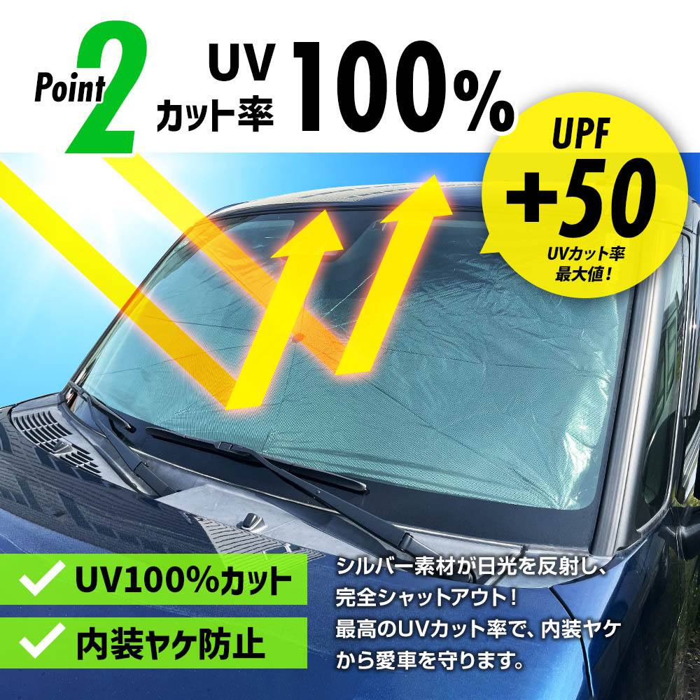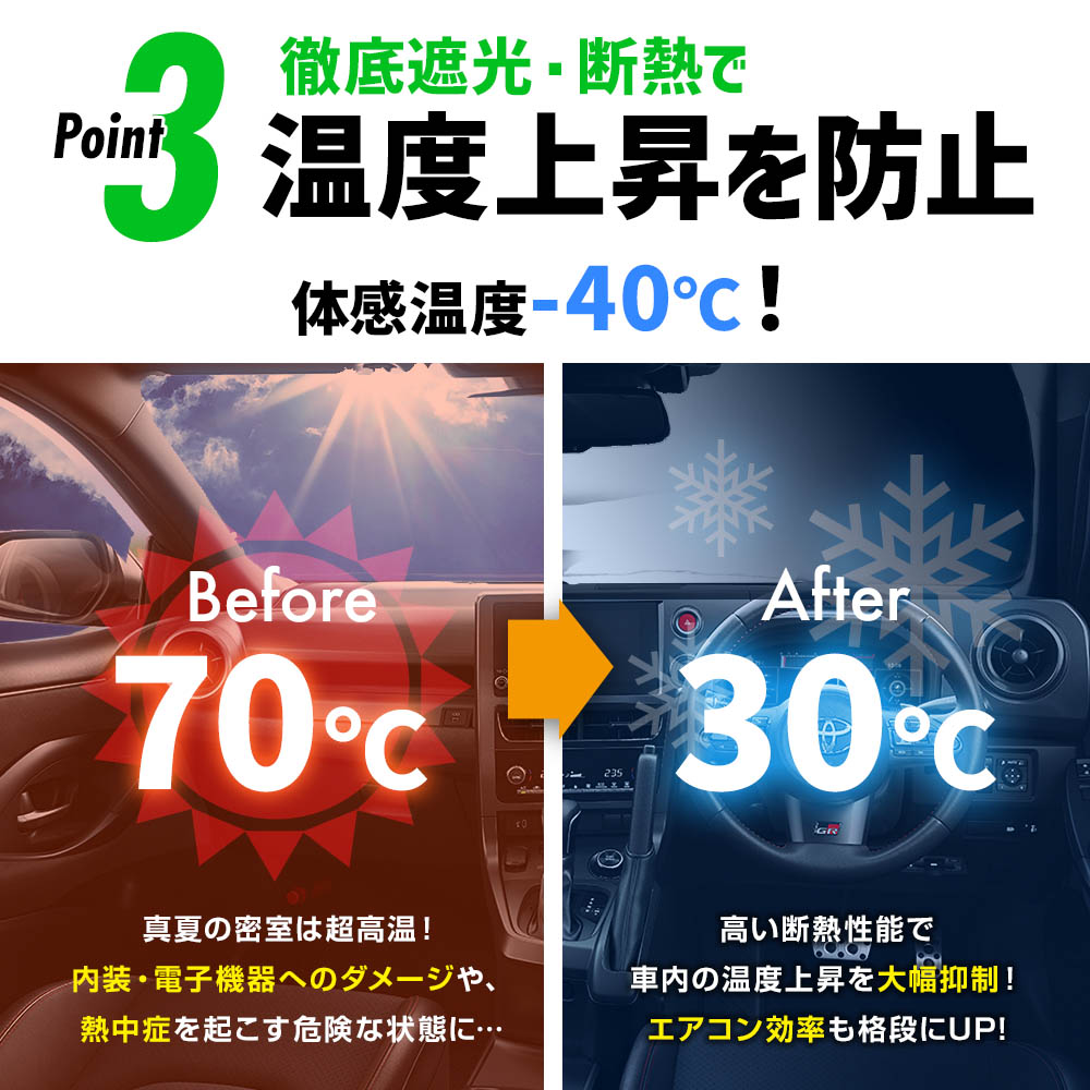 強い日差しをしっかりブロックし、紫外線による車内の劣化やハンドルの熱さを軽減。